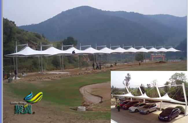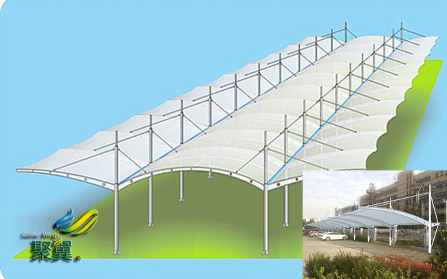 我們都知道張拉膜膜結(jié)構(gòu)車棚是鋼索從邊上穿過,拉出幾個角并固定在不同的高度之上,會形成高低落差,這樣的落差看起來是很美妙的,相對的展開面積就會大很多,因為在占地面積的陰影中,實際很多是重疊不垂直的。