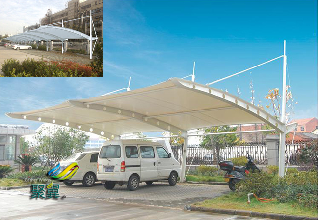 膜結(jié)構(gòu)車棚采用膜材的特性是其常用膜材為=聚酯纖維覆聚氯乙烯(PVC)和玻璃纖維覆聚聚四氟乙烯(PTFE)。膜結(jié)構(gòu)車棚PVC材料的主要特點(diǎn)是強(qiáng)度低、彈性大、易老化、徐變大、自潔性差,但膜結(jié)構(gòu)車棚價(jià)格便宜,容易加工制作,色彩豐富,抗折疊性能好。為改善其性能,可在膜結(jié)構(gòu)車棚表面涂一層聚四氟乙烯涂層,提高膜結(jié)構(gòu)車棚抗老化和自潔能力,其壽命可達(dá)到15年左右。