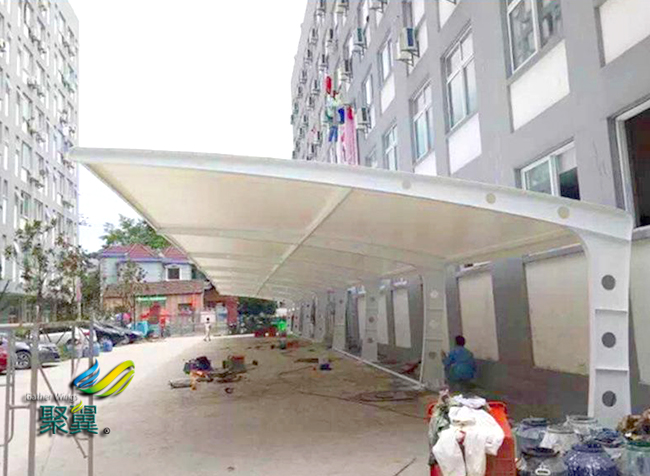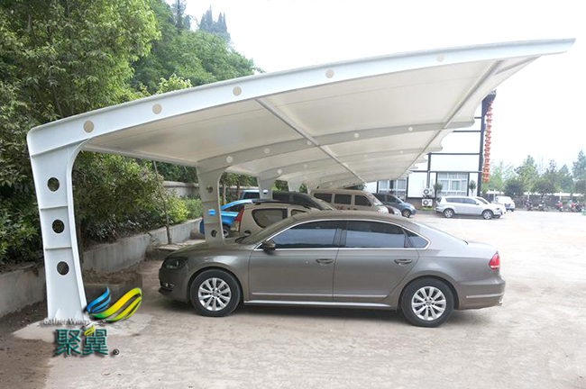 膜結(jié)構(gòu)車棚膜材、鋼索及支柱構(gòu)成,利用鋼索與支柱在膜材中導(dǎo)入張力以達(dá)安定的形式。膜結(jié)構(gòu)車棚除了可實(shí)踐具創(chuàng)意,創(chuàng)新且美觀的造型外,也是最能展現(xiàn)膜結(jié)構(gòu)車棚精神的構(gòu)造形式。