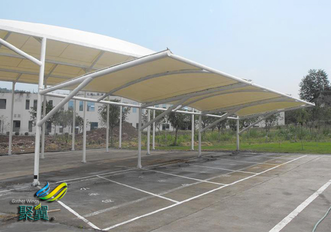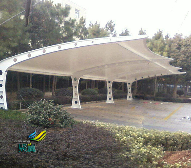 膜結(jié)構(gòu)車棚輕便性:重量輕,絕對保證棚下人和物的安全。但由于荷載作用下膜結(jié)構(gòu)車棚材料會產(chǎn)生變形,膜面坡度較小處可能會有積水。