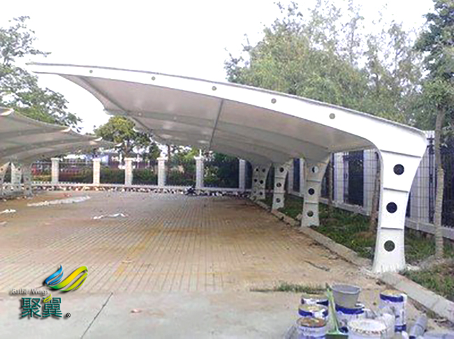 膜結(jié)構(gòu)車棚采用膜材的特性是其常用膜材為聚酯纖維覆聚氯乙烯(PVC)和玻璃纖維覆聚聚四氟乙烯(PTFE)。膜結(jié)構(gòu)車棚PVC材料的主要特點(diǎn)是強(qiáng)度低、彈性大、易老化、徐變大、自潔性差,但膜結(jié)構(gòu)車棚價(jià)格便宜,容易加工制作,色彩豐富,抗折疊性能好。為改善其性能,可在膜結(jié)構(gòu)車棚表面涂一層聚四氟乙烯涂層,提高膜結(jié)構(gòu)車棚抗老化和自潔能力,其壽命可達(dá)到15年左右。