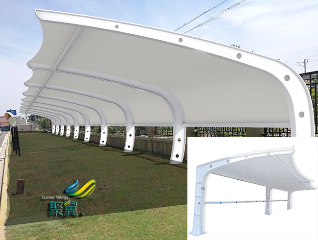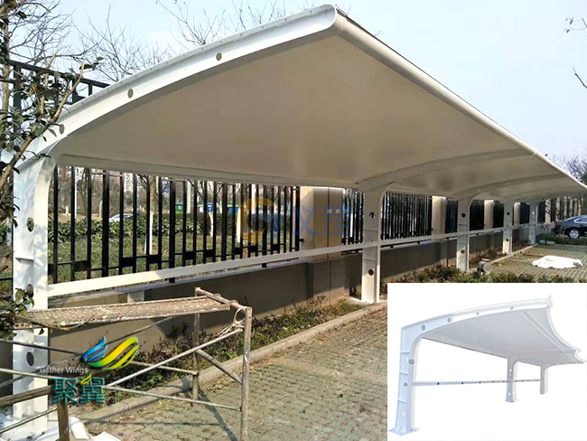 膜結構車棚可以很好地覆蓋整個體育場式張力膜結構,使空間跨度增大,同時降低了建筑物的結構,降低了建筑物的整體重量,施工方便安全。這些也是膜結構車棚選擇的重要原因。膜結構車棚膜材料表面包覆,防止灰塵和雨水侵蝕,保護膜結構,提高使用壽命。