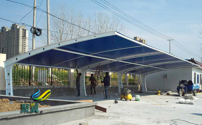 膜結(jié)構(gòu)車棚安裝過程中不應(yīng)發(fā)生雨水積存現(xiàn)象。同時(shí)應(yīng)根據(jù)降雨的程度決定工程的中止和繼續(xù)。