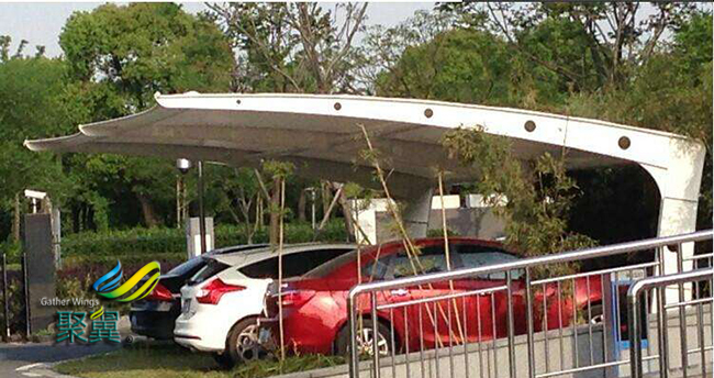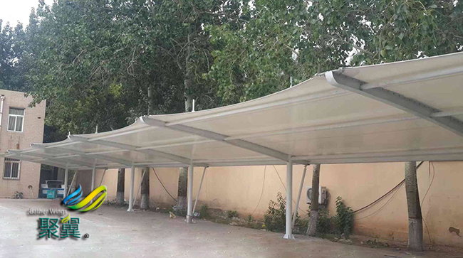 膜結(jié)構(gòu)車棚PVC材料的主要特點是強度低、彈性大、易老化、徐變大、自潔性差,但膜結(jié)構(gòu)車棚價格便宜,容易加工制作,色彩豐富,抗折疊性能好。為改善其性能,可在膜結(jié)構(gòu)車棚表面涂一層聚四氟乙烯涂層,膜結(jié)構(gòu)車棚提高其抗老化和自潔能力,其壽命可達到15年左右。
