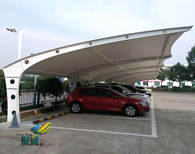 膜結(jié)構(gòu)車棚材料和輔助之間通過一定方式使膜結(jié)構(gòu)車棚內(nèi)部產(chǎn)生張力,在形成的力的控制下形成某種空間形狀,作為覆蓋結(jié)構(gòu)或者建筑物主體,這種窄間結(jié)構(gòu)類型具有足夠剛度來抵抗外部荷載作用。