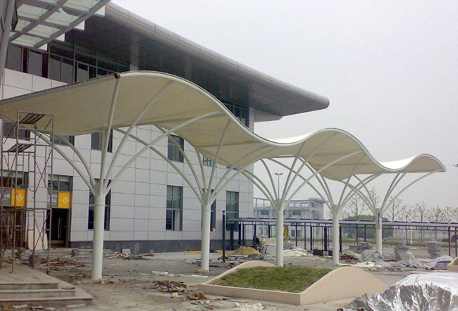 對膜結(jié)構(gòu)車棚的形狀設(shè)計、荷載分析、裁剪設(shè)計,應(yīng)在考慮施工過程的基礎(chǔ)上進(jìn)行一體化的設(shè)計。