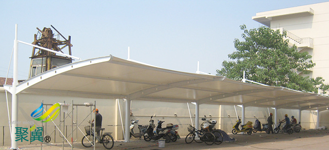 膜結(jié)構(gòu)車棚自行車棚不只具有美麗的外觀、特性的外型并且其功用也對比突出,膜結(jié)構(gòu)車棚是城市綠色化建造的一大輔佐。