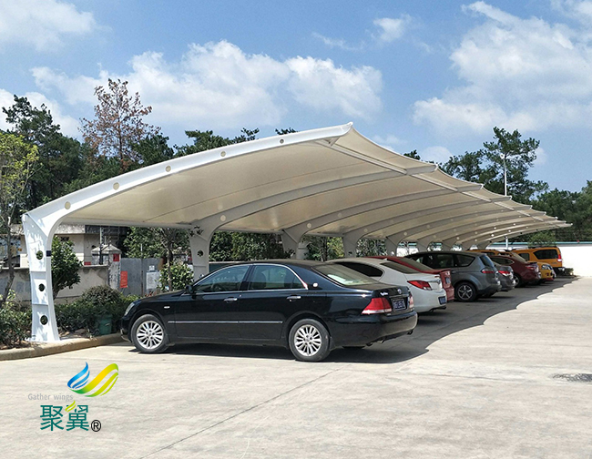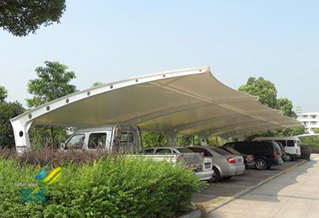膜結構車棚PVC材料的主要特點是強度低、彈性大、易老化、徐變大、自潔性差,但膜結構車棚價格便宜,膜結構車棚容易加工制作,色彩豐富,抗折疊性能好。