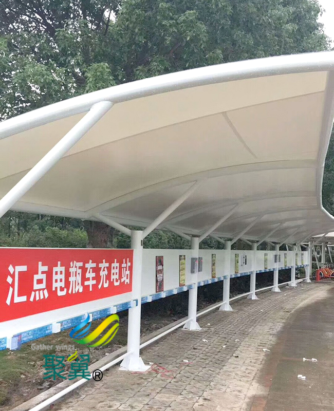 膜結(jié)構(gòu)車棚自行車棚主要是由兩部分構(gòu)成,主體由鋼構(gòu),膜結(jié)構(gòu)車棚頂部由膜布(張拉膜)/PVC,正是因?yàn)檫@樣的結(jié)構(gòu),讓膜結(jié)構(gòu)車棚在美觀度上可以很好的適應(yīng),同進(jìn)它的使用時(shí)間也最長(zhǎng),像這種骨架的最長(zhǎng)壽命可以達(dá)到三十年以上。