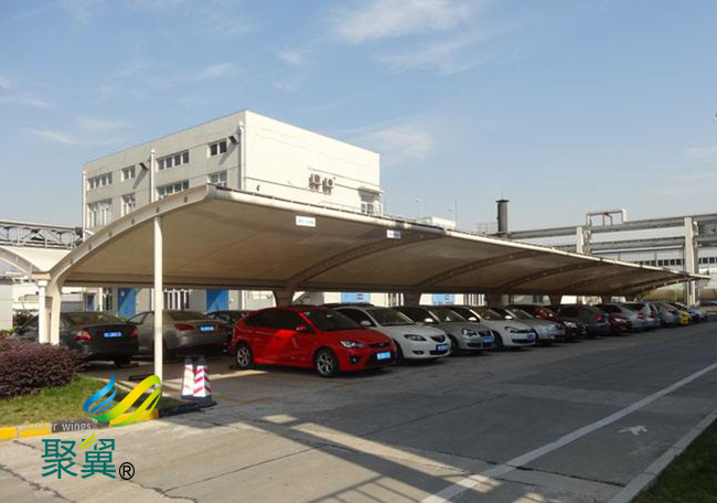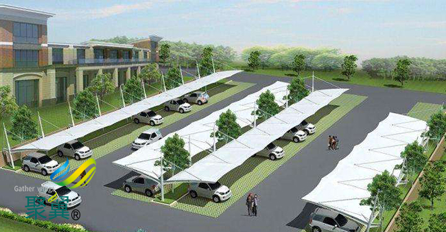 膜結(jié)構(gòu)車棚膜材、鋼索及支柱構(gòu)成,使用鋼索與支柱在膜材中導入張力以達安定的方式。除了可實踐具構(gòu)思,立異且美觀的造型外,也是最能展現(xiàn)膜結(jié)構(gòu)車棚精力的結(jié)構(gòu)方式。