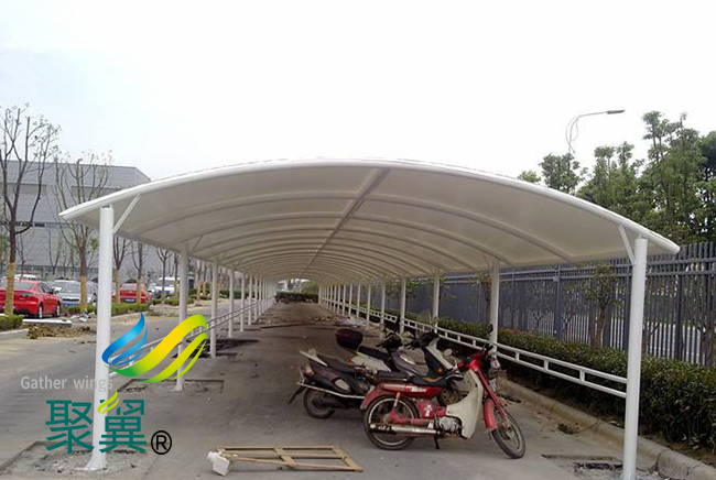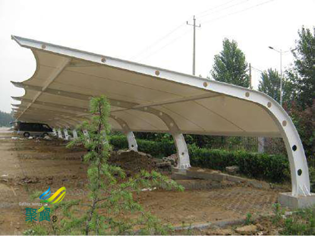 膜結構車棚施工精度要求高,結構功能強,且膜結構車棚具豐富的表現(xiàn)力,所以造價略高于骨架式膜結構車棚。