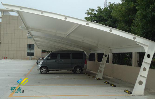 膜結構車棚中所使用的膜材料每平方壹公斤左右,由于自重輕,加上鋼索、膜結構車棚鋼結構高強度材料的采用,與受力體系簡潔合理——力大部分以軸力傳遞,故使膜結構車棚適合跨越大空間而形成開闊的無柱大跨度結構體系。