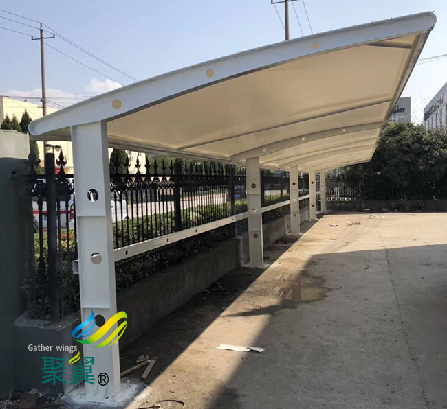 膜結(jié)構(gòu)車棚受力點小,單位尺寸上能承受的壓強(qiáng)高,因此在多次的實踐中,膜結(jié)構(gòu)車棚都穩(wěn)固如山。