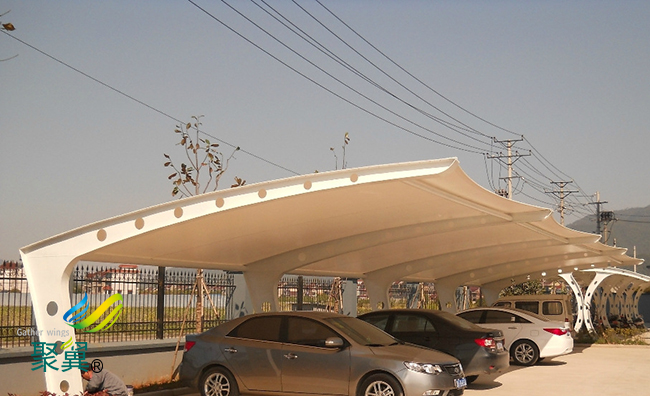 膜結(jié)構(gòu)車棚是一種新型的材料,具有藝術(shù)性、經(jīng)濟性、保溫性、自潔性、阻燃性、吸聲性和透光性。
