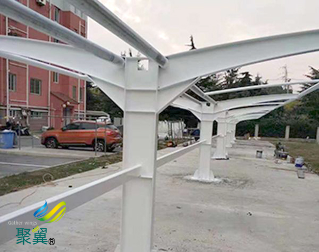 膜結(jié)構(gòu)車棚整體框架采用方鋼焊接成型龍骨架,框架整體做防銹處理,刷防銹底漆三遍,膜結(jié)構(gòu)車棚表面噴涂白色高級汽車漆,停車棚主立柱采用150×150鍍鋅方管作停車棚的支撐柱,膜結(jié)構(gòu)車棚身整體結(jié)構(gòu)牢固抗震防風系數(shù)高,耐腐蝕。