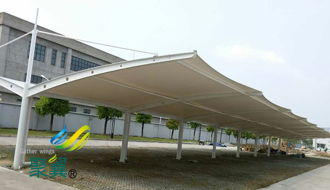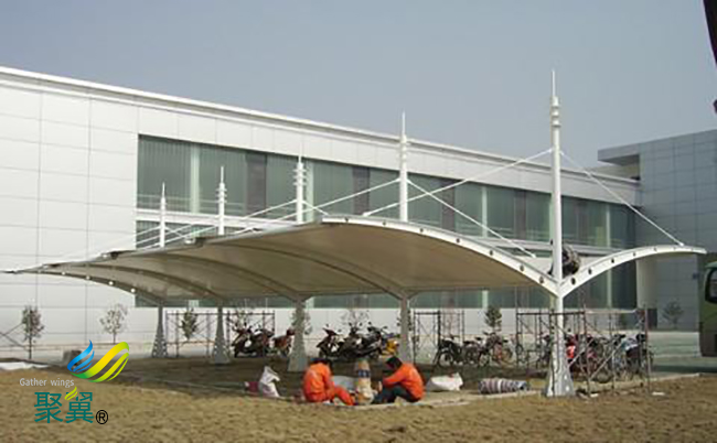 膜結構車棚本身是依靠膜自身的張拉應力與支撐桿和拉索共同構成的體系,此結構特別適合用來建造城市標志性建筑物。
