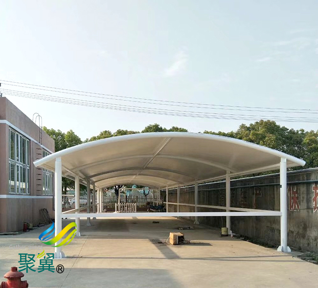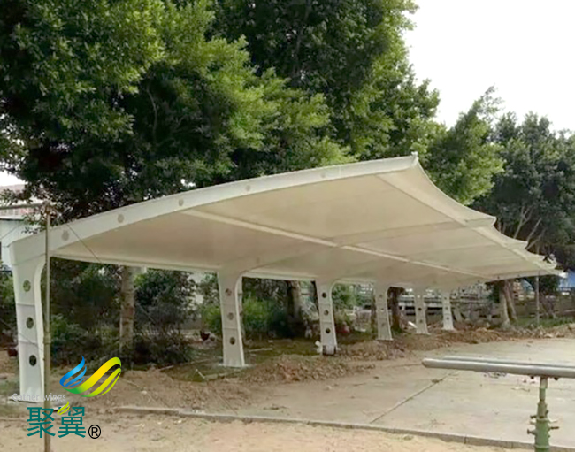 膜結(jié)構(gòu)車棚已經(jīng)在各種公共場所廣泛使用,膜材有較高的反射性及較低的光吸收低,并且熱傳導性較低,這極大程度上阻止太陽能進入棚內(nèi)。膜結(jié)構(gòu)車棚膜材的半透明性保證了適當?shù)淖匀宦⑸涔庹彰髋飪?nèi)。
