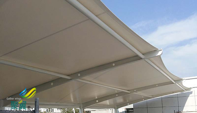 膜結(jié)構(gòu)車棚除了一般雨蓬不可比擬的實(shí)用、耐用、遮風(fēng)擋雨的功能外,膜結(jié)構(gòu)車棚雨蓬更是一座雕塑,一件藝術(shù)品,給人美的視覺享受。膜結(jié)構(gòu)車棚柔美,其曲線,其剛?cè)岵?jì),其豐富造型,其潔白無瑕,讓人眼前一亮,回味悠長(zhǎng)。