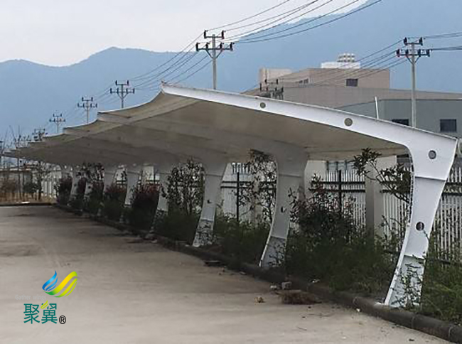 膜結(jié)構(gòu)車棚自潔性。膜建筑中采用具有防護(hù)涂層的膜材,本身不發(fā)黏,落到膜材表面的灰塵可以靠雨水的自然沖洗而達(dá)到良好的自潔效果,同時(shí)膜結(jié)構(gòu)車棚保證建筑的使用壽命。