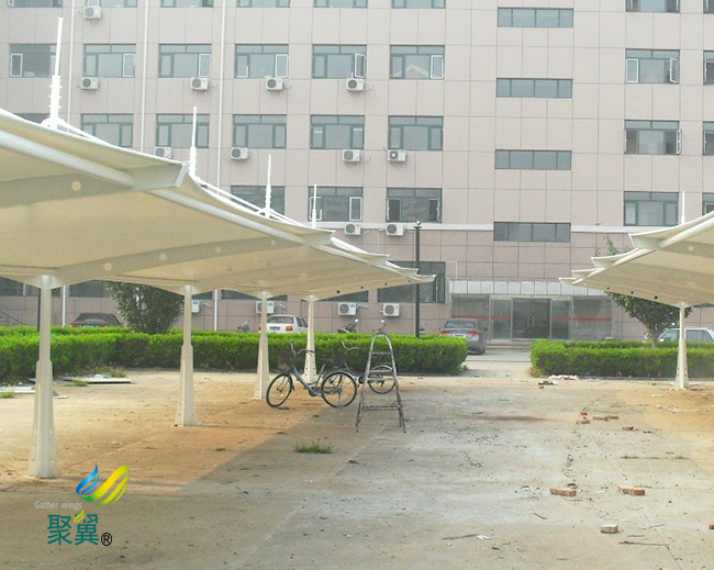 膜結構車棚的強度高,重量很輕,跨度也是很大的。這種結構所采用的材料是一種強度很高的織物材料,縱橫交織,采用的是雙面涂層。