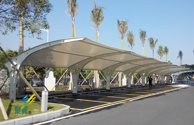 膜結(jié)構(gòu)車棚所用膜材料由基布和涂層兩部分組成.基布主要采用聚酯纖維和玻璃纖維材料;涂層材料主要聚氯乙烯和聚四氟乙烯。膜結(jié)構(gòu)車棚常用膜材為聚酯纖維覆聚氯乙烯(PVC)和玻璃纖維覆聚聚四氟乙烯(Teflon)。