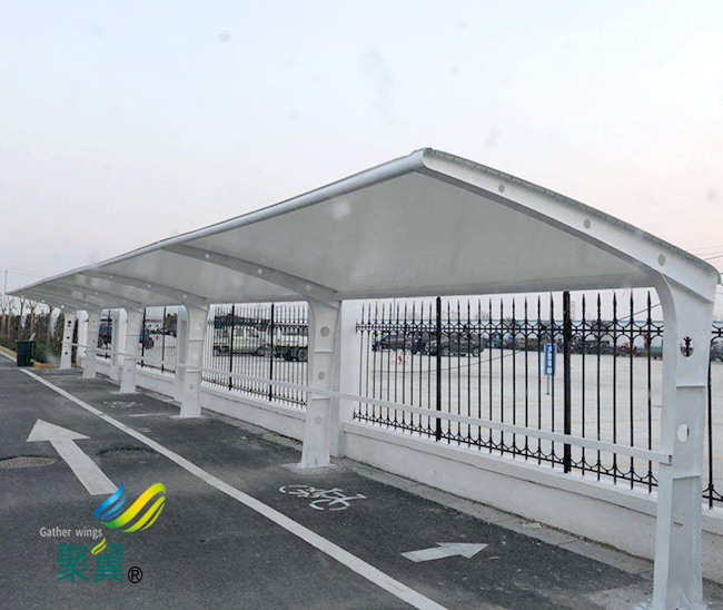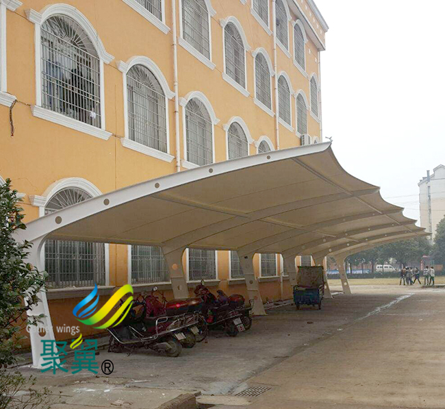 膜結(jié)構(gòu)車棚修建不斷增加選用膜結(jié)構(gòu)。此外,比如停車棚、收費(fèi)站、商業(yè)街等都逐步選用膜結(jié)構(gòu)車棚修建。修建膜資料的運(yùn)用壽命為 25 年以上,在運(yùn)用期間,在雪或風(fēng)荷載效果下均能保持資料的力學(xué)形狀安穩(wěn)不變。