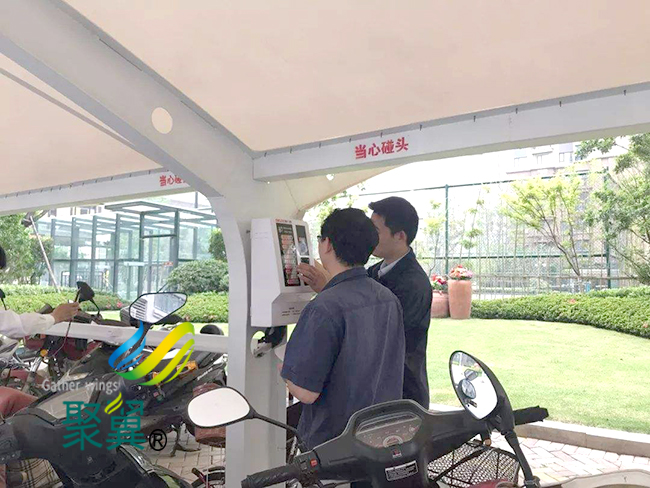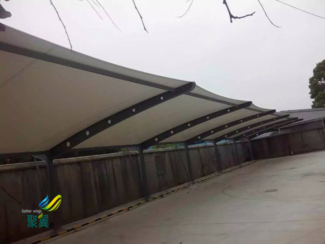 T102涂層的膜結(jié)構(gòu)車棚成本稍高,約為PVC膜結(jié)構(gòu)車棚的二倍,以聚酯纖維織物為基材,二氧化鈦(Tio2)做為表面處理材料,其使用年限可到達15年以上。