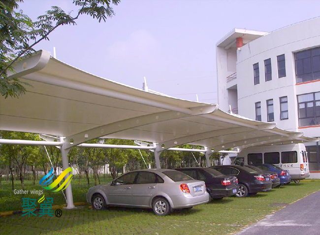 膜結(jié)構(gòu)車棚表面有防紫外線的共擠層,可防止太陽紫外線引起的樹脂疲勞變黃。膜結(jié)構(gòu)車棚表面共擠層具有化學(xué)吸收紫外線并轉(zhuǎn)化為可見光。對植物光合作用有良好的穩(wěn)定效果(極適合保護(hù)各類車、貴重藝術(shù) 品及展品,使其不受紫外線破壞)。