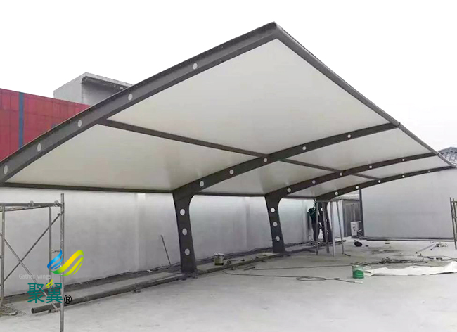 膜結構車棚立柱底腳選用10mm厚鋼板與預埋件結實焊接,在裝置泊車棚的時分將預埋件用混凝土澆筑后,膜結構車棚用螺栓與立銜接,抗風系數高,添加 膜結構車棚全體結實程度,膜結構車棚能反抗12級以上颶風來襲4、膜結構泊車棚內部選用Φ38鍍鋅圓管與 膜結構車棚結構焊接,加強棚頂部強度,可讓棚內感覺寬闊亮堂,停靠車輛輕松便利,完全符合泊車棚制造要求標準。