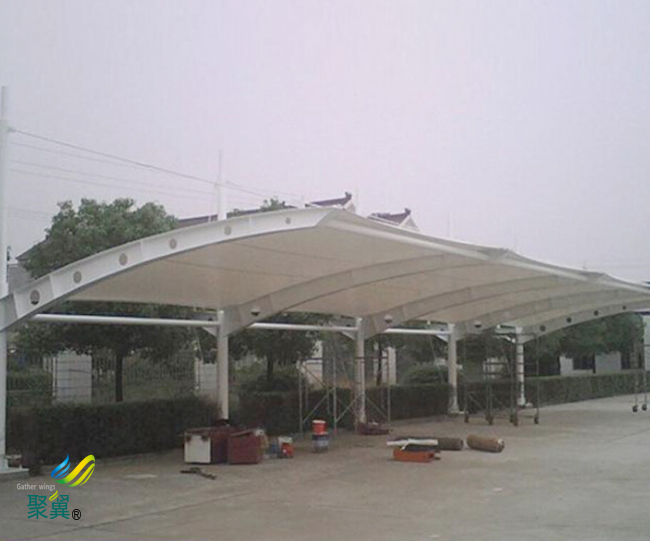 膜結(jié)構(gòu)車棚PVC膜材料膜布具有強(qiáng)度高、耐久性好、防火難燃、自潔性好,而且不受紫外光的影響,膜結(jié)構(gòu)車棚使用壽命在20年以上。并且透過膜材料的光線是自然散漫光,不會(huì)產(chǎn)生陰影,也不會(huì)發(fā)生眩光。