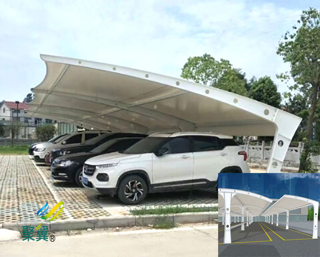 同時膜結(jié)構(gòu)車棚頂部封板采用茶色(顏色可挑選)陽光板封頂,與膜結(jié)構(gòu)車棚整體骨架用壓條鉚接固定,膜結(jié)構(gòu)車棚耐酸堿腐蝕,有足夠強(qiáng)度對膜結(jié)構(gòu)車棚棚內(nèi)車輛起到保護(hù)作用。