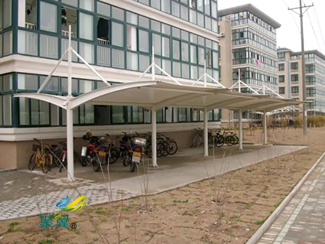 膜結(jié)構(gòu)車棚高強(qiáng)度的膜材出現(xiàn),再加上張拉技術(shù)的應(yīng)用,使膜結(jié)構(gòu)車棚抵御風(fēng)雨的能力是一般雨蓬之類不可比擬的,有的膜結(jié)構(gòu)車棚采用永久性膜材,可使用三、四十年。