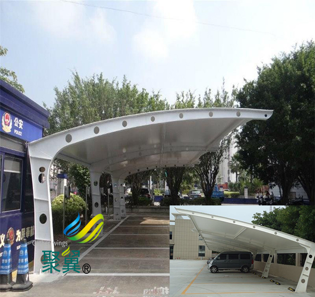 膜結(jié)構(gòu)車棚是由上面造型獨(dú)特的膜材質(zhì)和下面骨架的鋼結(jié)構(gòu)、鋼索組成的,現(xiàn)場裝置即可完結(jié)。