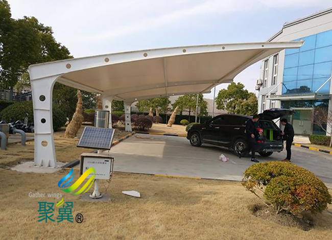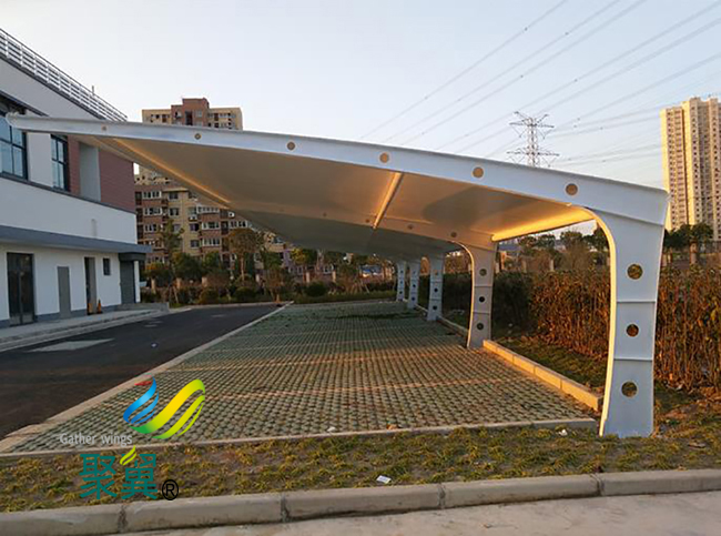 色彩性,膜結構車棚在棚內人們對白色或米白色膜材會有很好的色彩感知,因為這兩種色彩表現(xiàn)出對可見光具備線性光譜透射的特征。透射程度隨透射光波長的增添而增添,這使得透射光比入射光略暖和。透射光譜與纖維及其特性、涂層的厚度等。