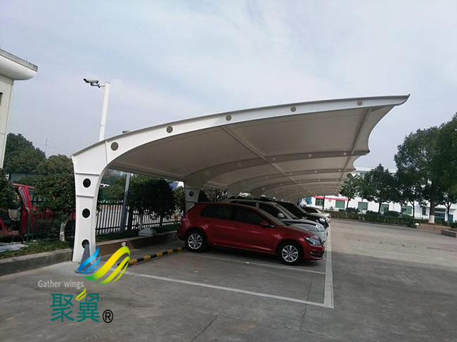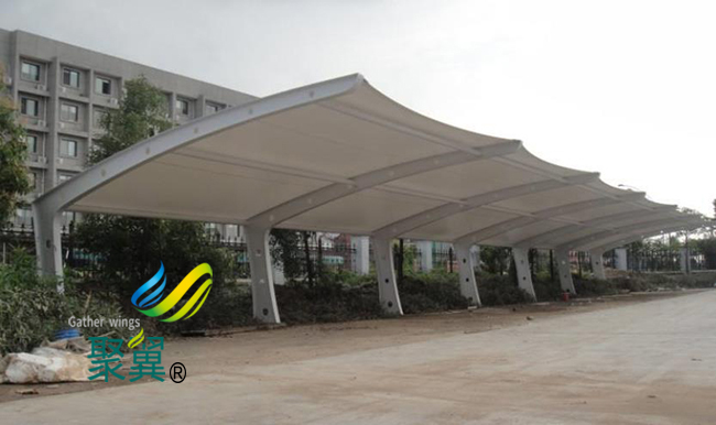 膜結(jié)構(gòu)車棚是由上面造型獨(dú)特的膜材質(zhì)和下面骨架的鋼結(jié)構(gòu)、鋼索 組成的,現(xiàn)場(chǎng)裝置即可完結(jié)。