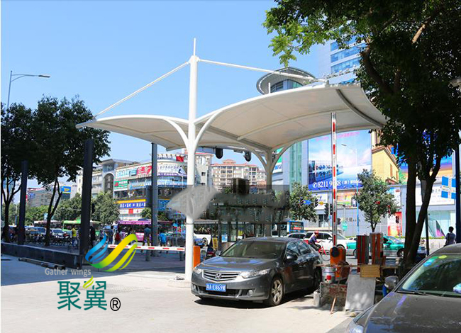 膜結(jié)構(gòu)車棚耐用:由于高強(qiáng)度的膜材出現(xiàn),再加上張拉技術(shù)的應(yīng)用,使膜結(jié)構(gòu)車棚抵御風(fēng)雨的能力是一般雨蓬之類不可比擬的。有的車棚采用永久性膜材,可使用三、四十年。