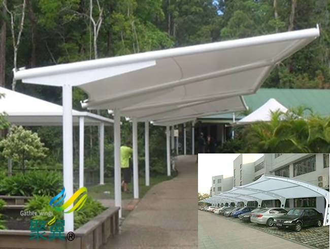 膜結(jié)構(gòu)車棚可以利用雨水的自然沖刷來(lái)清潔建筑物的外觀,也可以增加建筑物的使用壽命,膜結(jié)構(gòu)車棚還具有運(yùn)輸方便、比較新并且方便、不易積雪等優(yōu)點(diǎn)。