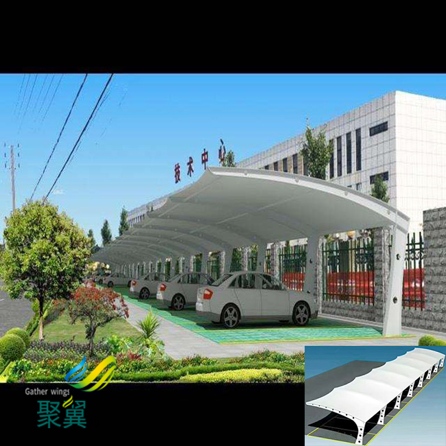 膜結(jié)構(gòu)車棚PVC材料的主要特點(diǎn)是強(qiáng)度低、彈性大、易老化、徐變大、自潔性差,但價(jià)格便宜,容易加工制作,色彩豐富,抗折疊性能好。為改善其性能,可在膜結(jié)構(gòu)車棚表面涂一層聚四氟乙烯涂層,提高膜結(jié)構(gòu)車棚抗老化和自潔能力,其壽命可達(dá)到15年左右。