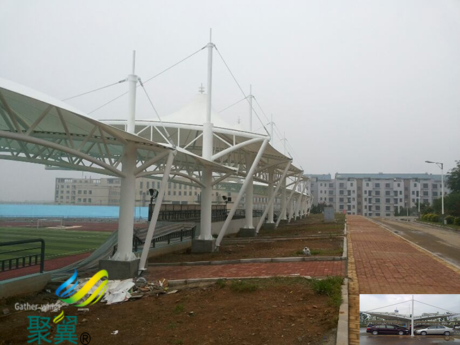 首先,車棚是一種公用建筑物,是由建設(shè)單位出資進(jìn)行修建,所以這種產(chǎn)品的首要要求就是耐用穩(wěn)固,金屬車棚都是金屬支撐柱,然后其上進(jìn)行焊接等工藝加裝頂棚。如果是采用的聚碳酸酯材料作為頂棚的話,采用螺栓固定。相對(duì)于膜結(jié)構(gòu)來說,整體能承受的載荷會(huì)小很多,遇到劇烈的暴風(fēng)雨天氣,頂棚會(huì)和支撐件分離。而膜結(jié)構(gòu)受力點(diǎn)小,單位尺寸上能承受的壓強(qiáng)高,因此在多次的實(shí)踐中,江蘇省南通市海安縣膜結(jié)構(gòu)車棚都穩(wěn)固如山。 江蘇省南通市海安縣膜結(jié)構(gòu)車棚的透光性:金屬車棚的頂棚一般都是采用聚碳酸酯材料或者是彩鋼板,二者的透光性和膜結(jié)構(gòu)相比,膜結(jié)構(gòu)材料的透光性更好,而且膜結(jié)構(gòu)作為一種高分子布的話,不會(huì)因?yàn)殚L時(shí)間的直曬變黃,也不會(huì)物理特性發(fā)生變化,比如變脆,軟化等現(xiàn)象。 車棚的重量輕,膜結(jié)構(gòu)車棚布是一種建筑織物,能承受高強(qiáng)度的沖擊和拉伸,而且可以任意變形。因此膜結(jié)構(gòu)在行業(yè)內(nèi)有“不破玻璃”的稱號(hào)。同時(shí)成本只有其它結(jié)構(gòu)車棚的一半或者更少。藝術(shù)性:江蘇省南通市海安縣膜結(jié)構(gòu)車棚最值得一提的是它可以根據(jù)支撐構(gòu)件的位置和高低排列組成不同的形狀,這在金屬車棚上是無法想象的。如在車棚頂部通過拉伸索,使膜結(jié)構(gòu)布邊沿向上翻起。這要是在彩鋼上只能通過對(duì)彩鋼板進(jìn)行預(yù)熱加工才行,需要耗費(fèi)極大的代價(jià)。而在膜結(jié)構(gòu)材料上,通過支撐和張拉索就能構(gòu)成。所以江蘇省南通市海安縣膜結(jié)構(gòu)車棚可以通過自身柔美的曲線和周圍的藝術(shù)景觀結(jié)合起來,給人以美的享受。在進(jìn)行江蘇省南通市海安縣膜結(jié)構(gòu)車棚的荷載態(tài)響應(yīng)分析時(shí),需考慮以下荷載及作用:恒荷載、活荷載、雪荷載、風(fēng)作用、預(yù)張力、支承及邊界構(gòu)件的變形、地震作用以及溫度變化的影響等等。