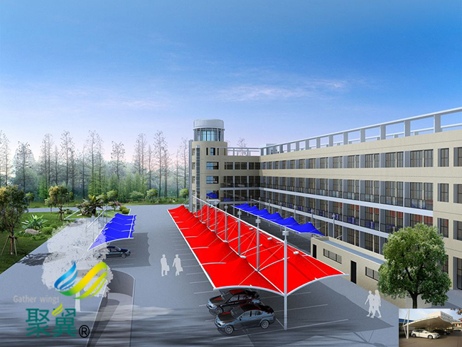 膜結(jié)構(gòu)車棚本身是依靠膜自身的張拉應力與支撐桿和拉索共同構(gòu)成的體系,此結(jié)構(gòu)特別適合用來建造城市標志性建筑物,如體育與娛樂性場館,廣告效應的商場、餐廳、城市的命脈的關(guān)鍵性建筑,這時新型膜材用于此可以體現(xiàn)出更好的益處。