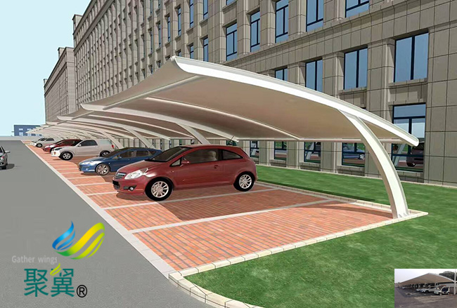 膜結(jié)構(gòu)車棚本身是依靠膜自身的張拉應(yīng)力與支撐桿和拉索共同構(gòu)成的體系,此結(jié)構(gòu)特別適合用來建造城市標(biāo)志性建筑物,如體育與娛樂性場(chǎng)館,廣告效應(yīng)的商場(chǎng)、餐廳、城市的命脈的關(guān)鍵性建筑,這時(shí)新型膜材用于此可以體現(xiàn)出更好的益處。