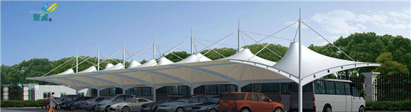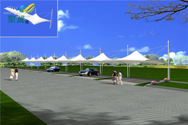 骨架式膜結(jié)構(gòu)停車棚、以鋼構(gòu)或是集成材構(gòu)成的屋頂骨架后,在其上方張拉膜材的構(gòu)造形式,下部支撐結(jié)構(gòu)安定性高,因屋頂造型比較單純,開口部不易受限制,且經(jīng)濟效益高等特點。膜結(jié)構(gòu)停車棚廣泛適用于任何大小規(guī)模的空間。張拉式膜結(jié)構(gòu)、以膜材、鋼索及支柱構(gòu)成,利用鋼索與支柱在膜材中導(dǎo)入張力以達(dá)安定的形式。除了可實踐具有創(chuàng)意、創(chuàng)新且美觀的造型外也是最能展現(xiàn)膜結(jié)構(gòu)精神的構(gòu)造形式。近年來,大型跨距空間也多采用以鋼索與壓縮材料構(gòu)成鋼索網(wǎng)來支撐上部膜材的形式。膜結(jié)構(gòu)停車棚施工精度要求高,結(jié)構(gòu)性能強,且具豐富的表現(xiàn)力。