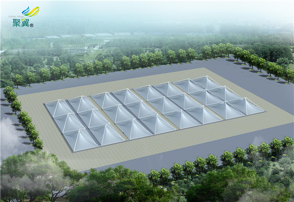 目前,污水池密封可采用:鋼支撐反吊膜、無骨架密封集氣罩、懸索反吊膜等不同的設(shè)計方案,每一種設(shè)計方案材料的用量都會有很大區(qū)別。一般采用鋼支撐反吊膜的較多,跨度太大時可以選擇無骨架密封集氣罩、懸索反吊膜等解決方案。