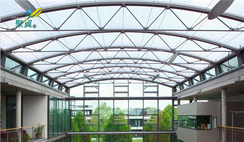 商業(yè)街道膜結(jié)構(gòu)的透明度可以為商業(yè)街道提供所需的照明,這對商業(yè)街道節(jié)能非常重要。通過綜合利用自然采光和人工照明,電影的透明度可以為商業(yè)街提供更大的審美創(chuàng)造空間。在夜晚,光傳輸將膜結(jié)構(gòu)轉(zhuǎn)變?yōu)楣獾袼?。通過膜和透光絕緣材料的適當(dāng)組合,可以使包含絕緣層的多層膜半透明。即使光譜傳輸僅為百分之幾,薄膜屋頂仍然是人眼的光澤和半透明,具有輕微的屋頂外觀。