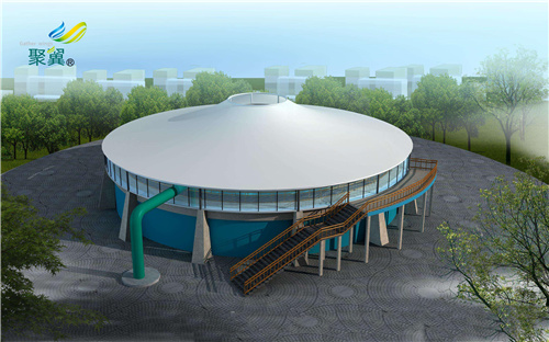 污水處理廠擔(dān)負(fù)著廢水排放的處理工作,是十分重要的一項(xiàng)環(huán)保工程,但是污水處理就不得不在一些池子中進(jìn)行沉淀、過濾,而池中散發(fā)的臭氣其實(shí)也是一種空氣污染,所以對(duì)污水池進(jìn)行加蓋就成為了一種新的環(huán)保項(xiàng)目。傳統(tǒng)的玻璃鋼加蓋雖然可以做到密閉、集氣,但使用壽命較短,而且還容易造成腐蝕產(chǎn)生新的污染,所以反吊膜結(jié)構(gòu)污水池棚罩就成了新的選項(xiàng),下面上海聚翼就帶大家看看反吊膜結(jié)構(gòu)在污水池的應(yīng)用與常見安裝方式。