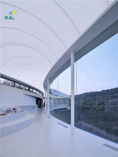 它的獨特曲面外形使其具有強烈的雕塑感。膜面通過張力達到自平衡。張拉膜結構可使建筑師設計出各種張力自平衡、復雜且生動的空間形式。在一天內(nèi)隨著光線的變化,雕塑般的膜結構通過光與影而呈現(xiàn)出不同的形態(tài)。日出和日落時,低入射角度的光線將突現(xiàn)屋頂?shù)那屎透〉裥Ч?,太陽位于遠地點時,膜結構的流線型邊界在地面上投入彎彎曲曲的影子。利用膜材的透光性和反射性,經(jīng)過設計的人工燈光也可使膜結構成為光的雕塑。