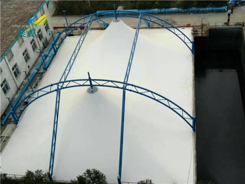 每一個城市的污水處理廠的惡臭氣體污染一直是頭痛的問題,可是大型池體(污泥氧化溝、濃縮池、消化池)的氣體收集是最難問題,我們要選擇的材料是要壽命長、韌性好、抗風雨,不容易撕裂漏氣。污水池加蓋除臭體主要針對池體惡臭氣體收集的最有效辦法就是對污水池進行加蓋密封,再通過進風口和出風口進行換氣,把惡臭氣體抽送到智力裝置中進行除臭處理。選擇污水池加蓋膜結構可以一次性解決所有問題。