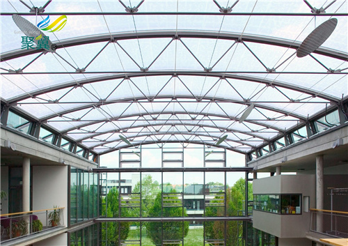 半透明是膜結(jié)構(gòu)最顯著的特征,與其它材料相比,無論是在美觀上或是在操作上,都有顯著的優(yōu)越性;散射光線,消除眩光,能將光線廣泛地漫射到其內(nèi)部空間;材料內(nèi)部涂層具有較高的反射率,能在夜間保持室內(nèi)的照明效果;夜間逆光照射下表面發(fā)光;自然照明,節(jié)省能源。
