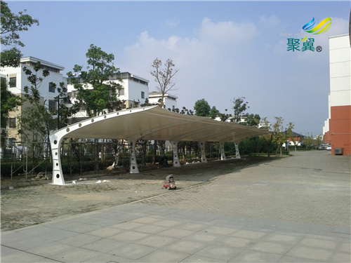 膜結(jié)構(gòu)車棚的安裝包括膜體展開、連接固定和張拉成形三個部分。除了一般雨棚不可比擬的耐用、實用、遮風(fēng)擋雨的功能外,膜結(jié)構(gòu)雨棚更是一座雕塑,一件藝術(shù)品,給人和種美的視覺享受。