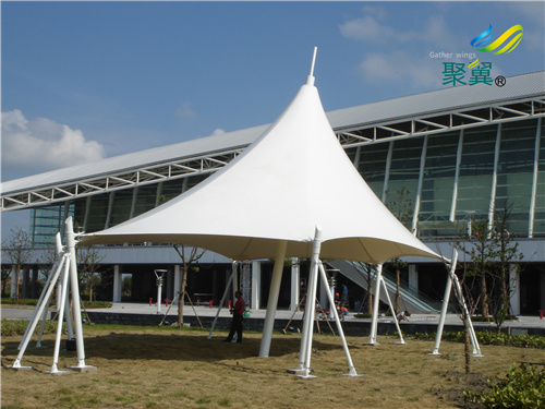 膜結(jié)構(gòu)停車棚布的安裝應連續(xù),當無法連續(xù)一次性完成安裝作業(yè)時應采取可靠臨時固定措施,以便抵抗施工期間可能發(fā)生的強風,同時還要注意張拉膜面不積水。